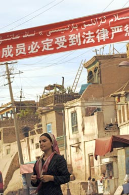 ![]() A sign above a street of Kashgar reads leaders and members of the illegal Islamic Liberation Party will be severely punished by law. Kashgar is within a few hundred kilometres of the Afghanistan, Pakistan and Indian borders and its people mostly belong to the 20 million ethnic Uihgurs who do not consider themselves Chinese but part of lost state of Turkestan (Richard Jones/Sinopix) Source: http://www.timesonline.co.uk/ |