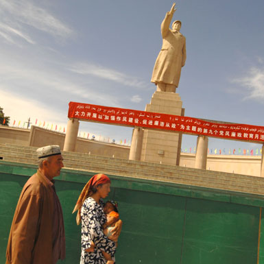 Local Uihgurs pass a 20 m-tall statue of Cahirman Mao that has been installed in The People's Square, Kashgar (Richard Jones/Sinopix)